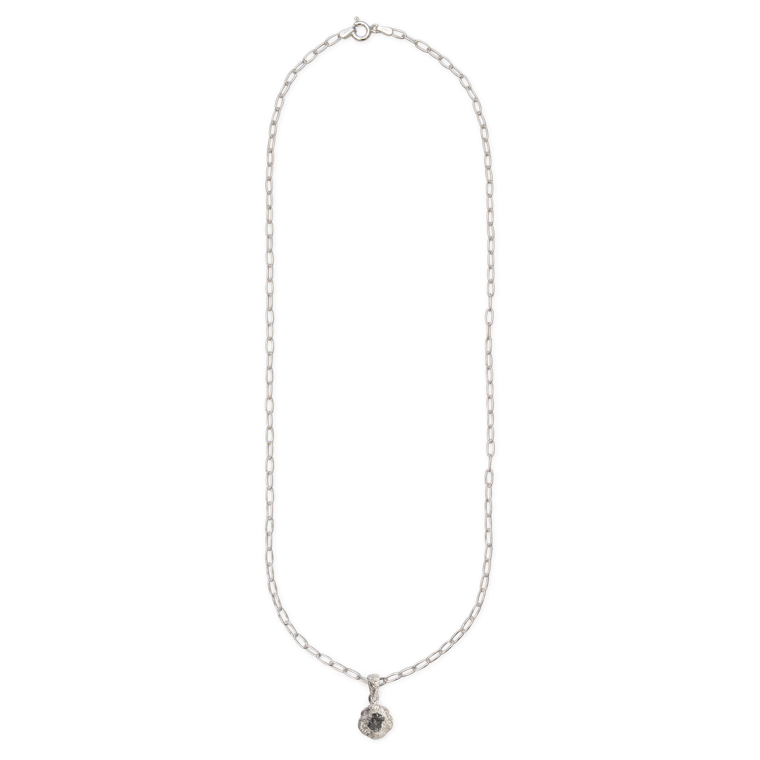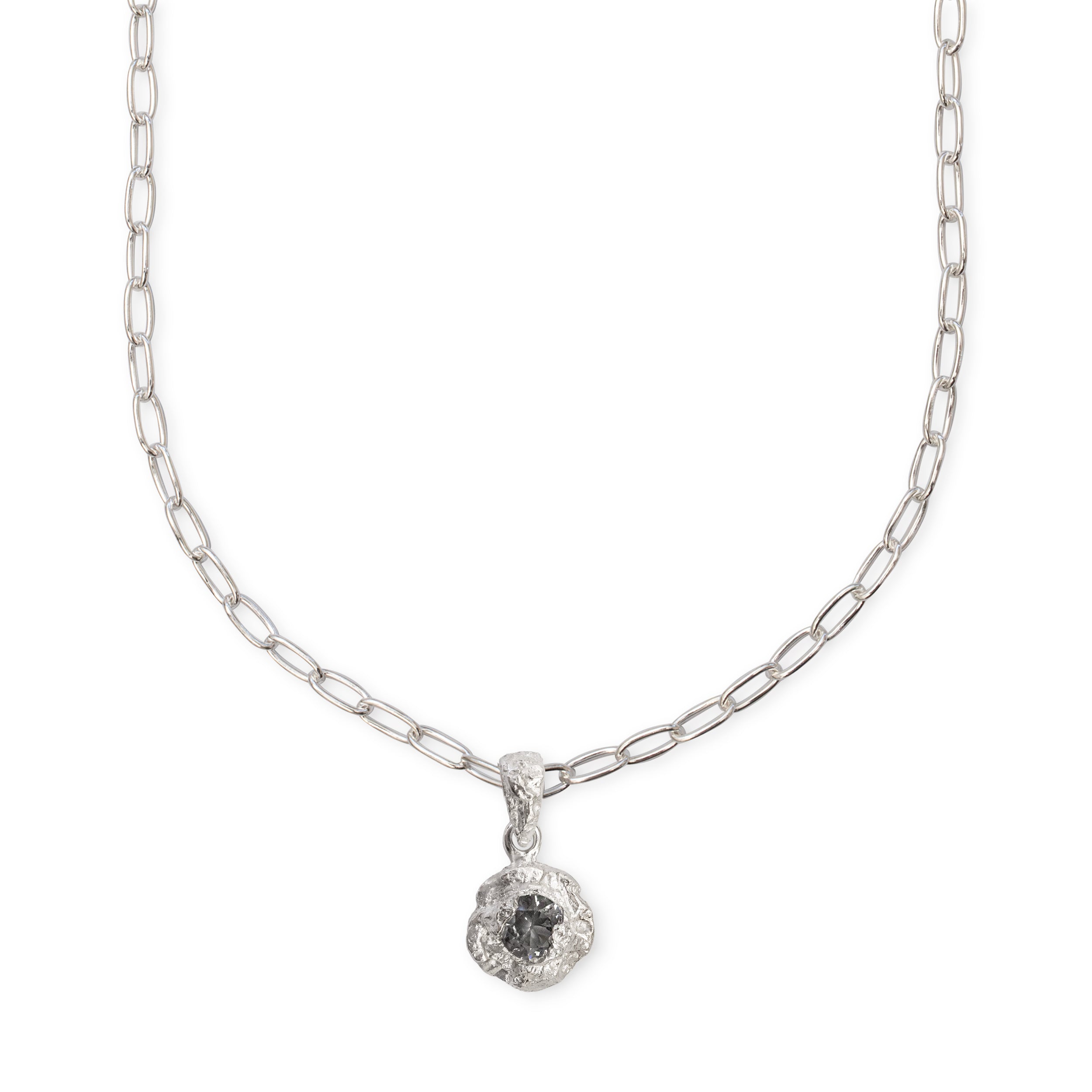 A petite, hand-carved pendant drawing inspiration from drifting masses in the night sky. Softly formed, they gradually part to reveal a grey Nano Crystal gemstone like a pale moon peering through the clouds.