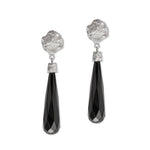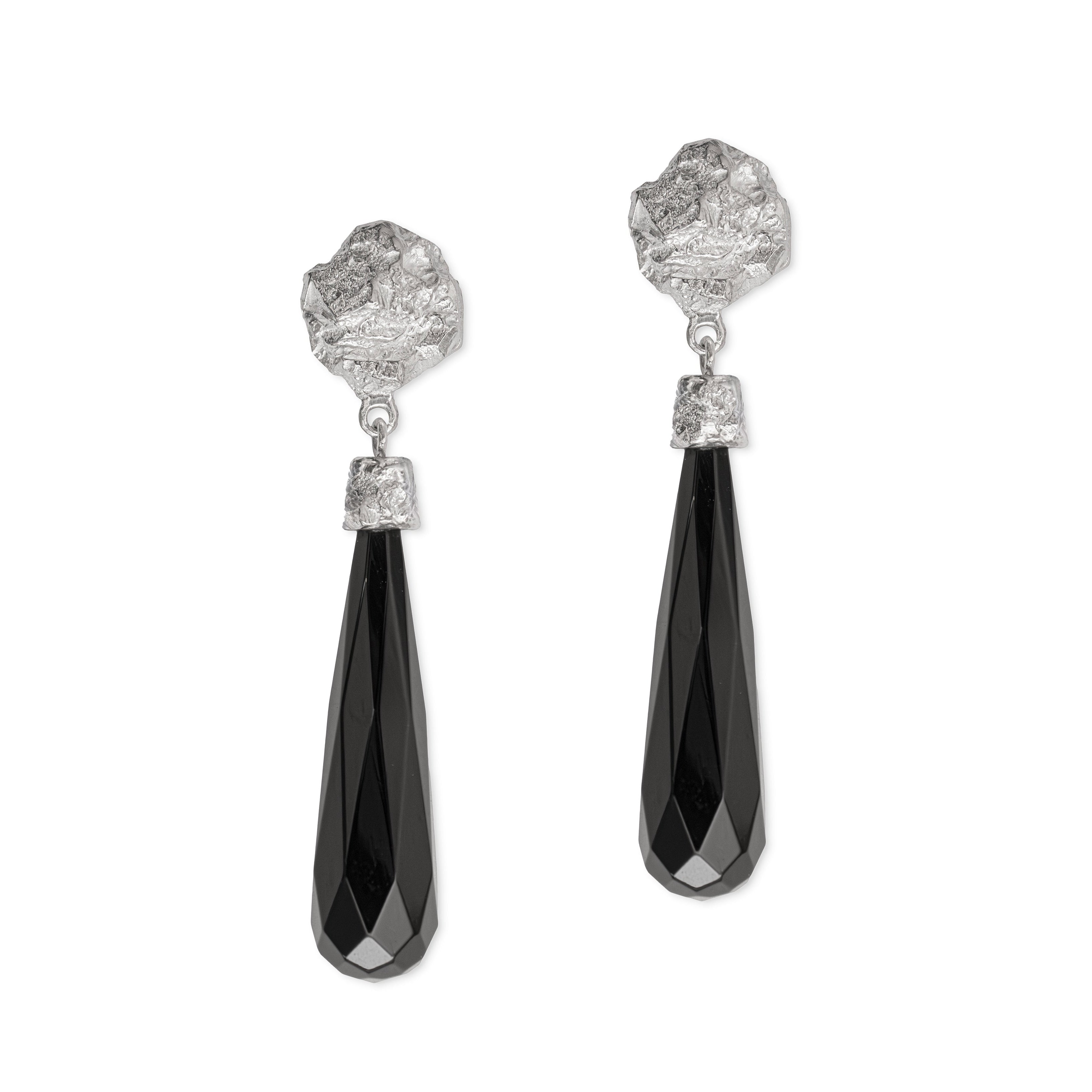 Hand-carved drop earrings featuring elongated, faceted onyx stones suspended from rugged, textured bright silver studs. The contrast between the polished gemstones and rocky metal creates a luxurious sense of sculptural poise, creating an adornment that feels both grounded and elevated.