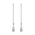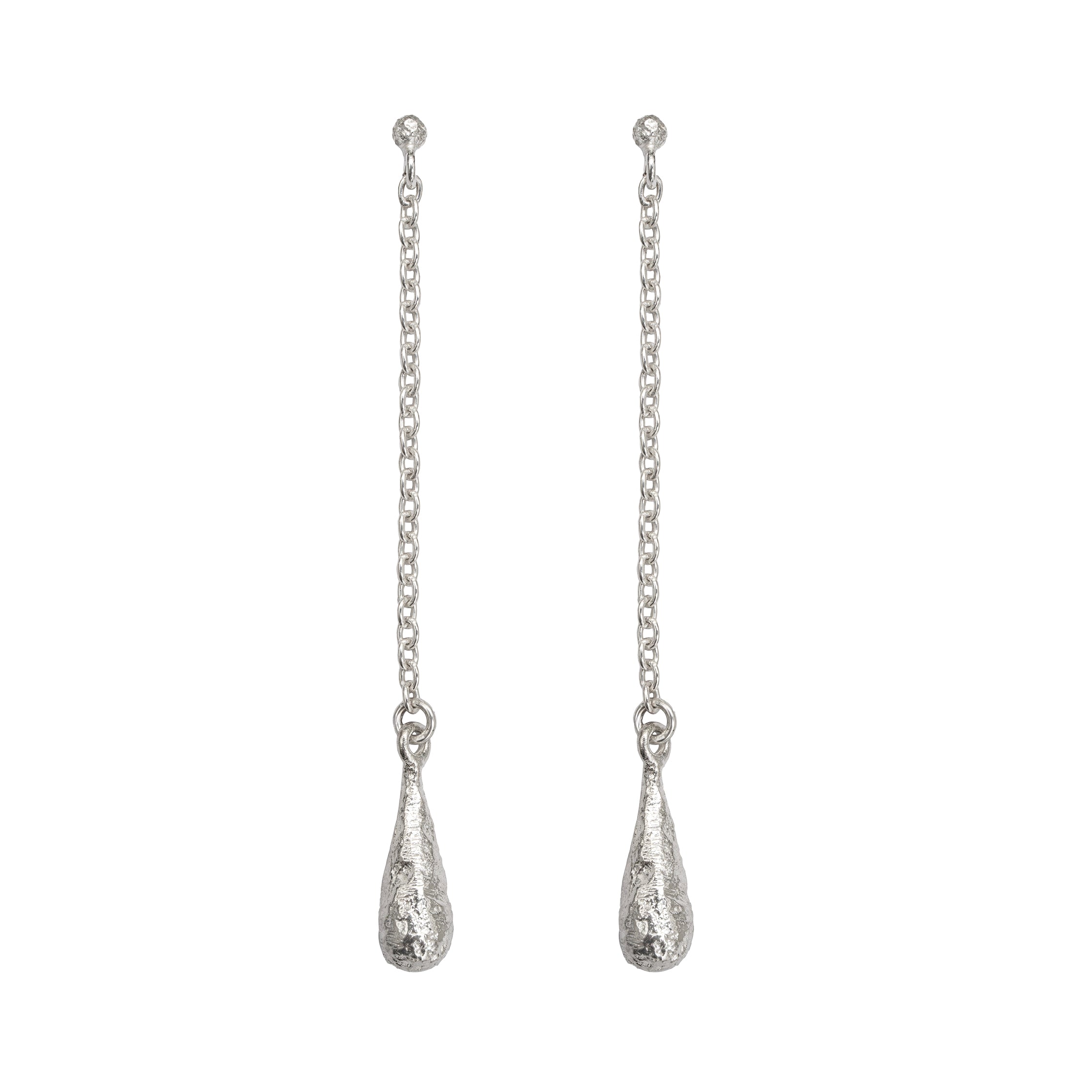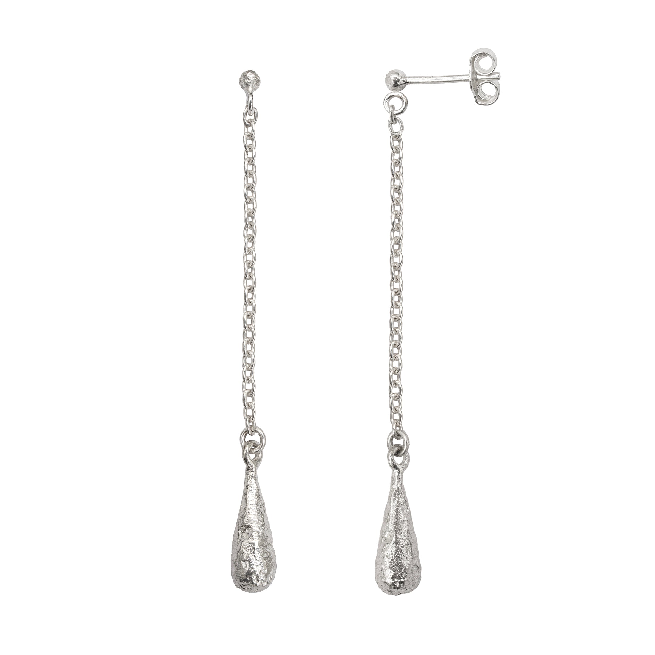 A new expression of the Tristresse teardrop motif, our eroded teardrop becomes a suspended gesture of movement and light. Each small, hand-carved teardrop hangs from a fine cable chain attached to a textured silver stud, creating an elongated silhouette that shifts gently with motion. Crafted in solid Sterling Silver, they balance refinement with raw texture—an evolution of the familiar, and a study in transformation. Available in Bright Silver.