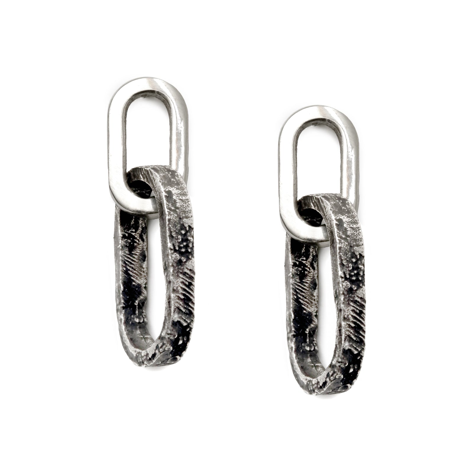A study in contrast, these hand-carved drop earrings feature a single polished oval link paired with an eroded, textured counterpart. The interplay of smooth and rugged surfaces creates a bold yet minimal composition—simple in form, striking in presence. Designed for those who appreciate raw refinement in its purest expression. Pictured in Blackened Silver finish, also available in Bright Silver.