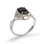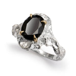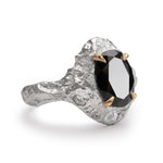 Hand-carved in bright sterling silver, this ring draws inspiration from the rugged terrain of vineyard landscapes—where soil, time, and cultivation shape the land. A large oval black gemstone is held in sculptural solid gold claws, a striking contrast against the textured silver. Organic yet bold, this piece reflects the raw beauty of nature’s slow transformation. Pictured in Bright Silver finish.