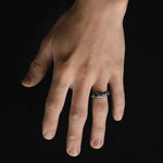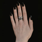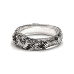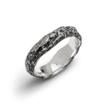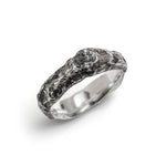 A fully textured solid silver ring with an eroded, blistered surface and uneven, deformed edges. Every inch of this piece carries the imprint of decay, its rugged form shaped by hand for a raw, sculptural presence. Designed to be worn alone or stacked with the Warp I Ring, creating a striking interplay of polish and texture. Pictured in Blackened Silver finish, also available in Bright Silver.