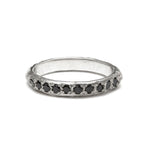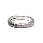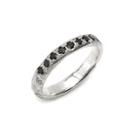 A slim ring band featuring alternating high-polish and deep-textured areas, creating contrast and depth. Encrusted with ten pavé-set black spinels, it balances refinement with a raw, organic feel. Handcrafted with meticulous detail, it is shown in Bright Silver, with a darkened finish available upon request. Perfect for stacking or as a standalone piece.