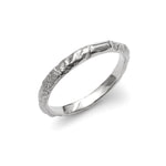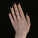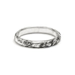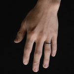 A slim silver stacking ring with a high-polish finish, subtly disrupted by molten, eroded detailing. The contrast between smooth and weathered surfaces gives the piece a quiet depth—refined yet organic, delicate yet enduring. Designed to be worn alone or layered, it carries a sense of quiet transformation in its form. Pictured in Blackened Silver finish, also available in Bright Silver finish.