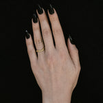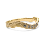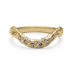 A curved stacking ring encrusted with six pavé-set salt & pepper diamonds, designed to contour effortlessly against other Alicia Hannah Naomi curved-profile rings. Hand-carved detailing across the front softens into a sleek, polished back, creating a balance of raw texture and refined elegance.