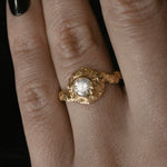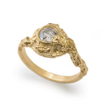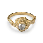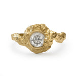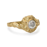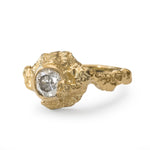 An elegantly asymmetric solid gold ring featuring a 0.50ct Salt & Pepper Diamond, embedded within a sculptural, rocky landscape. The gently waved and textured shoulders flow into a thin polished bezel, where raw texture subtly overlaps, echoing the soft formation of clouds. A balance of organic imperfection and refined detail, designed to feel both grounded and ethereal.