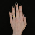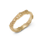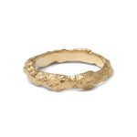 A hand-carved solid gold band featuring a rugged, geologically textured surface—eroded, organic, and shaped by time. Designed as a non-traditional wedding band or a distinctive stacking ring, it offers a raw yet refined alternative to classic silhouettes. Worn alone or paired with its matching solitaire, The Dawn Ring, it embodies the quiet beauty of nature’s imperfect forms.