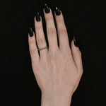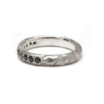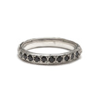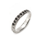 A slim ring band featuring alternating areas of high polish and deep texture, set with ten pavé black diamonds for a bold, modern contrast. A striking non-traditional alternative wedding ring, or a beautifully versatile stacking piece designed to be worn effortlessly for all occasions.