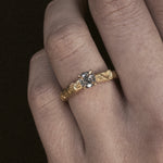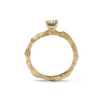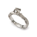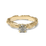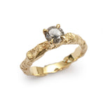 A delicate half-carat solitaire Salt & Pepper Diamond ring, set in a refined four-claw setting atop a geologically textured band. Crafted in solid gold, the raw, eroded surface contrasts with the precision of the setting, offering a non-traditional take on the classic solitaire. An alternative engagement ring designed for those who seek beauty in texture, imperfection, and the organic forms of the natural world.