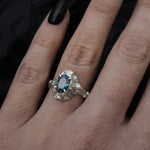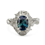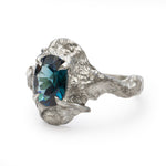 Sculptural cocktail ring crafted in 9ct Palladium White Gold, featuring a 1.15ct oval-cut Teal-Blue Parti Sapphire from Inverell, NSW. The central stone is held in four pointed talon claws, framed by rugged, uneven edges and balanced by a narrow polished shank. Cool-toned and quietly luminous, this piece evokes an oceanic landscape in winter—still, remote, and full of feeling. Designed for moments of significance, whether worn in celebration or quiet reflection.