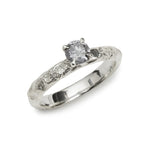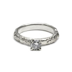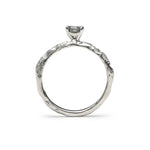 A delicate half-carat solitaire Salt & Pepper Diamond engagement ring, set in a refined four-claw setting. The slim band features alternating areas of high polish and deep texture, creating a quiet contrast between smooth refinement and raw, organic detail.