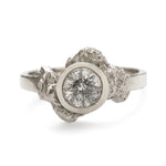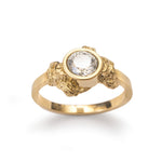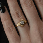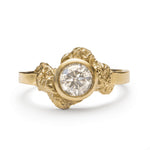 A delicate solid gold solitaire ring featuring a 0.50ct Salt & Pepper Diamond, set in a smooth polished bezel. The sleek band contrasts with hand-carved geological details that asymmetrically frame the stone—an ode to the quiet tension between refinement and raw, organic form.