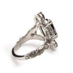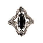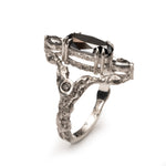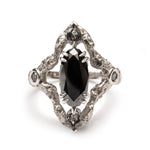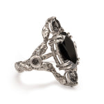 An intricate, highly detailed hand-carved cocktail ring crafted in solid gold, inspired by the rugged, knotted textures of ancient vines rooted in the land where wine is produced. Designed in a striking monochromatic palette, it features a bold Black Moissanite centre stone, complemented by Salt & Pepper Diamonds that add depth and contrast. Its sculptural form reflects both strength and fluidity—an ode to time, transformation, and the beauty found in nature’s rawest elements.