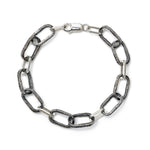A bold, hand-carved chain-link bracelet that reimagines traditional styling with a raw, unpolished edge. Alternating polished and rugged, eroded oval links create a striking interplay of texture, weight, and form. Crafted for presence and permanence, this piece is a testament to artisanal craftsmanship—substantial, tactile, and unapologetically bold. Pictured in Blackened Silver finish, also available in Bright Silver.