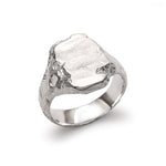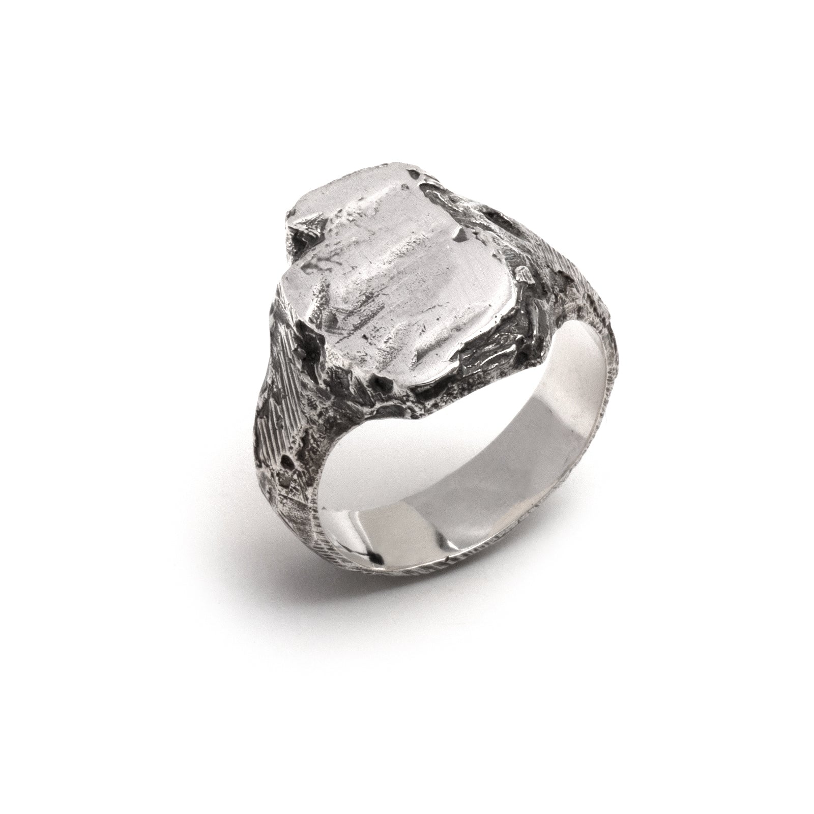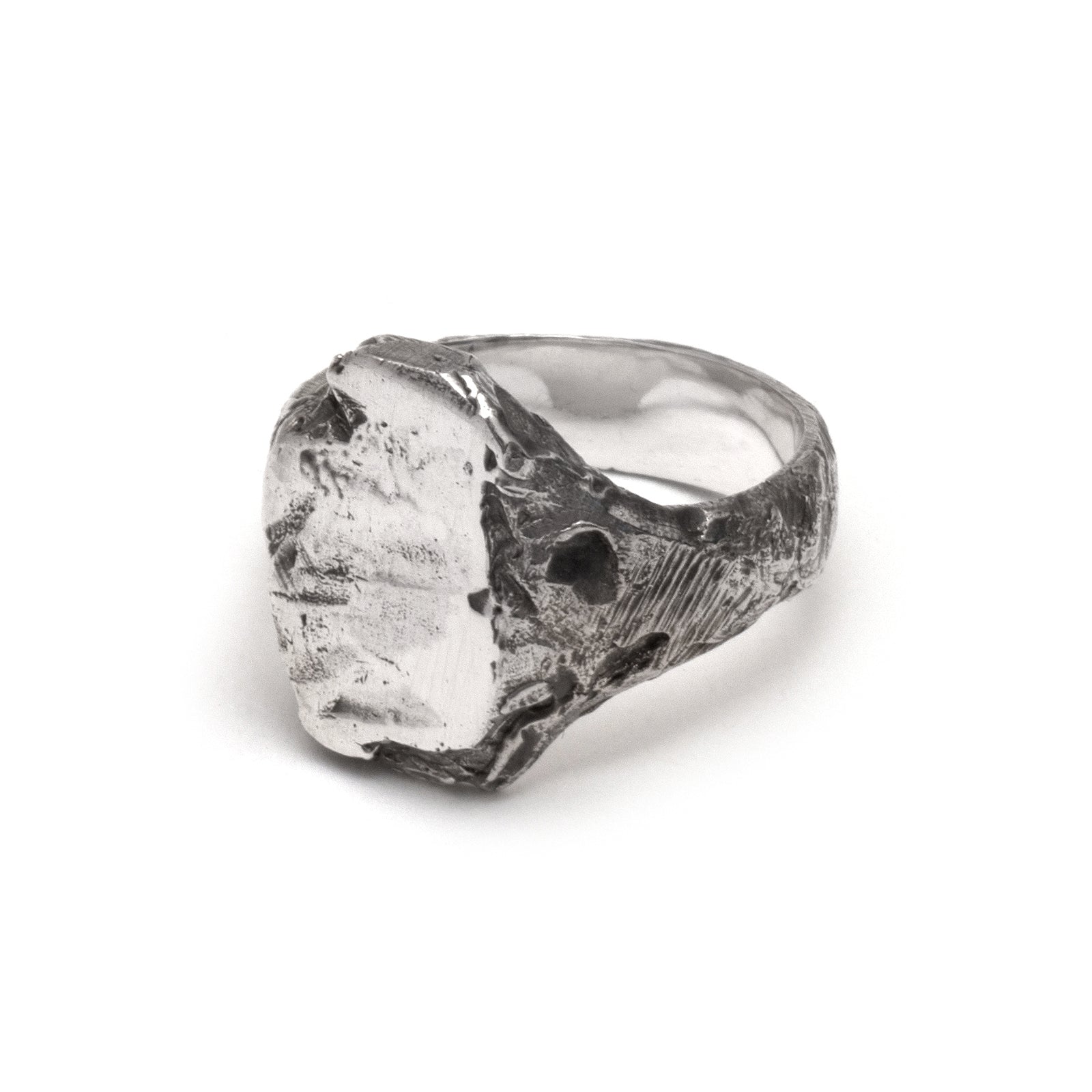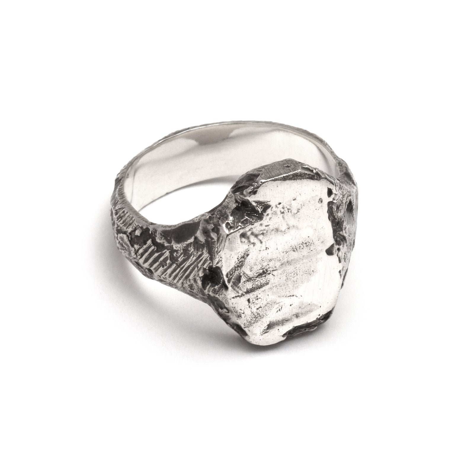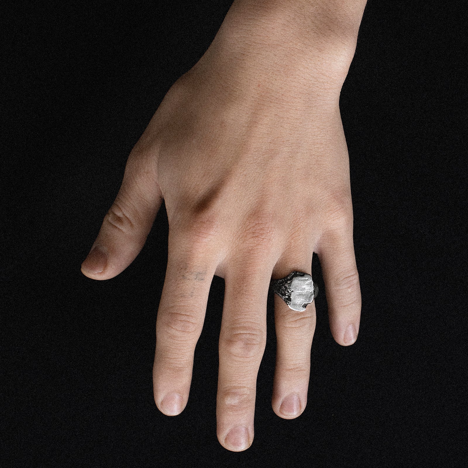 An asymmetric signet ring with a polished, molten façade contrasted by a distressed, textured band. The sculpted surface appears fluid yet weathered, balancing raw imperfection with refined detail.
