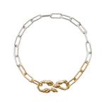 This dual-tone bracelet is the ideal adornment for anyone wishing to begin mixing metals in their collection. A thorny, vine-like hook clasp in solid 9ct Gold is flanked by three solid Gold links, with the remaining chain in Sterling Silver. Balancing sculptural tension with elegant minimalism, this piece lends itself to everyday wear.