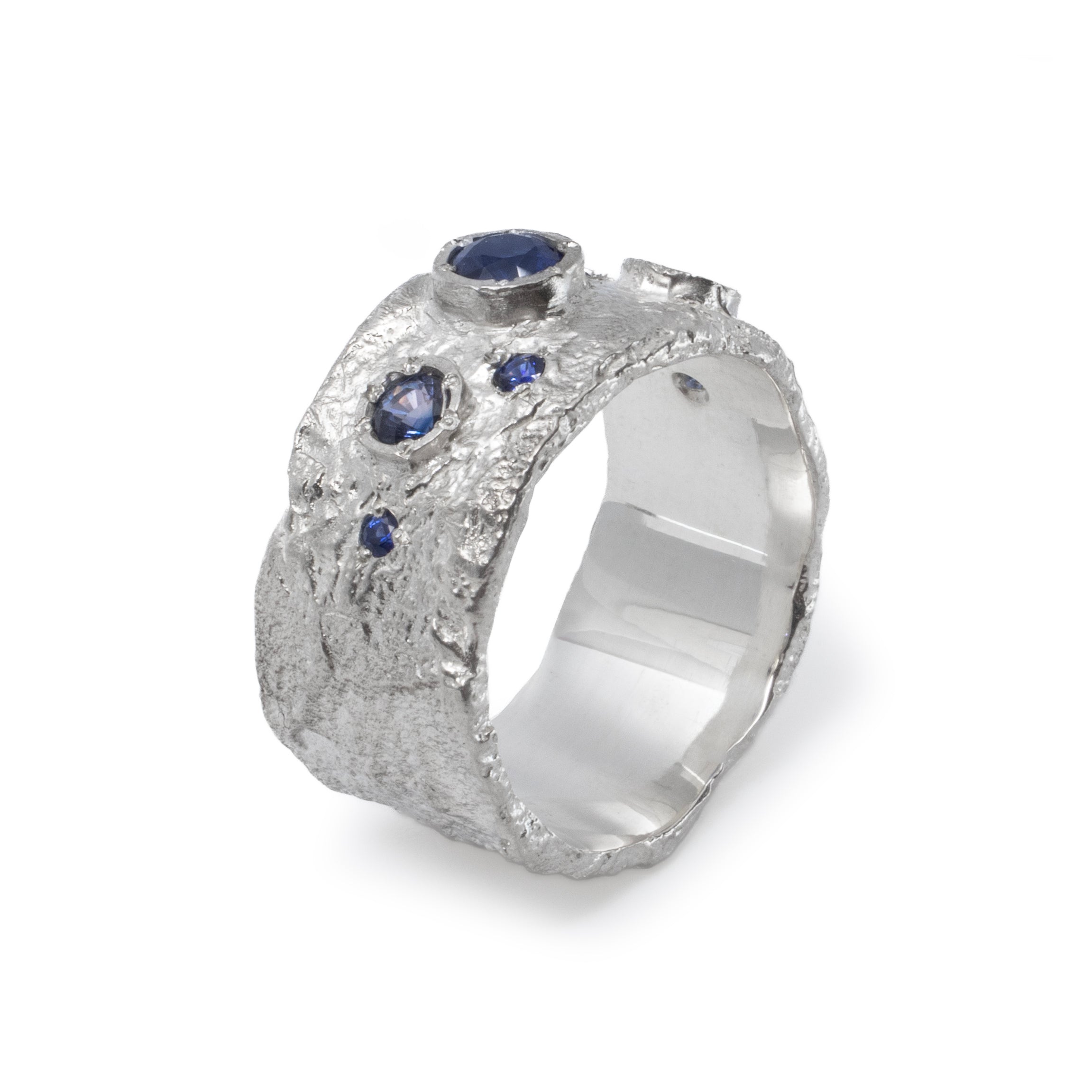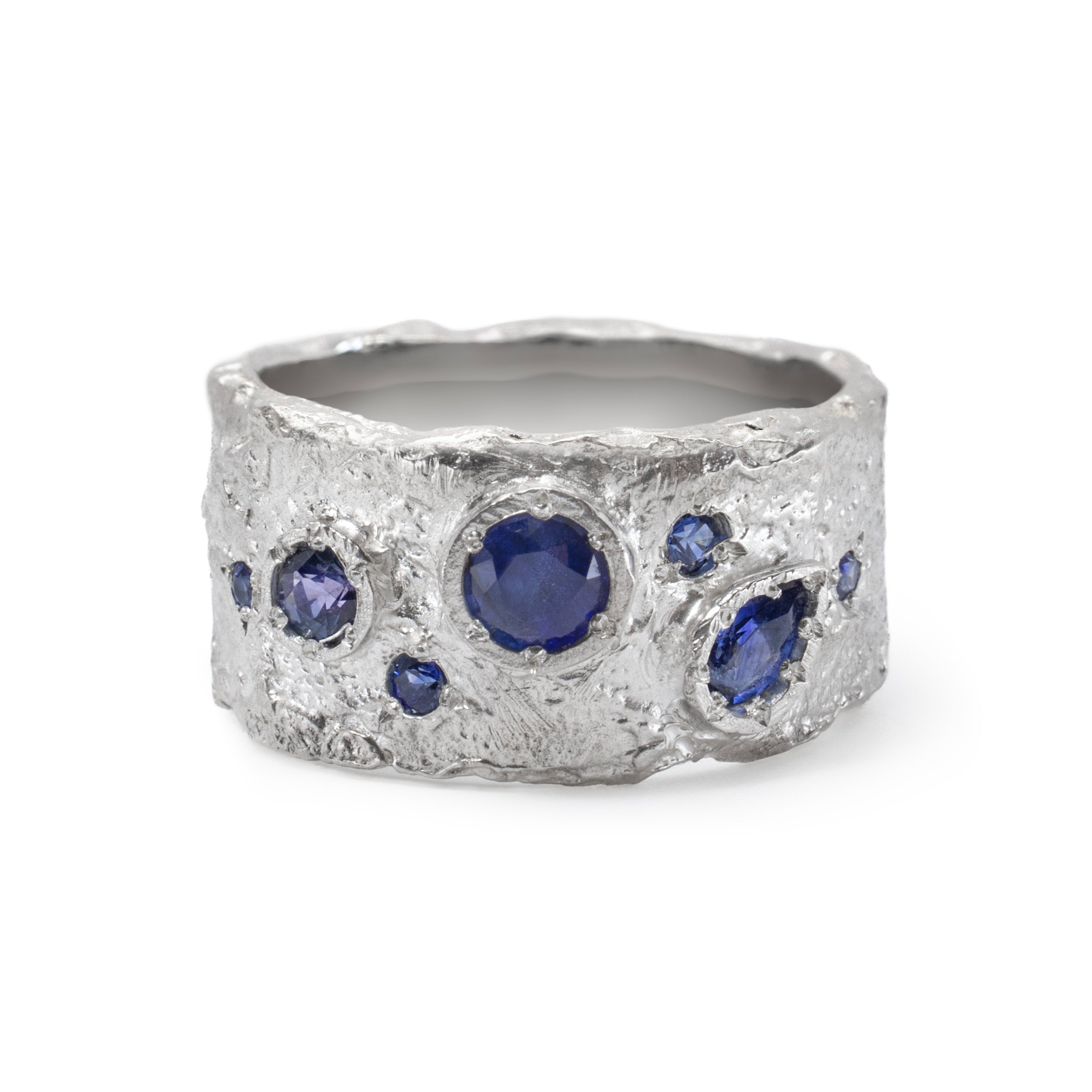 Sculptural, hand-carved cigar band with raw, uneven edges, crafted in Sterling Silver. It features seven mixed-cut sapphires in shifting blue-violet tones, scattered across the wide façade. One of a kind, this ring is bold, otherworldly, and designed to elevate your everyday wear.