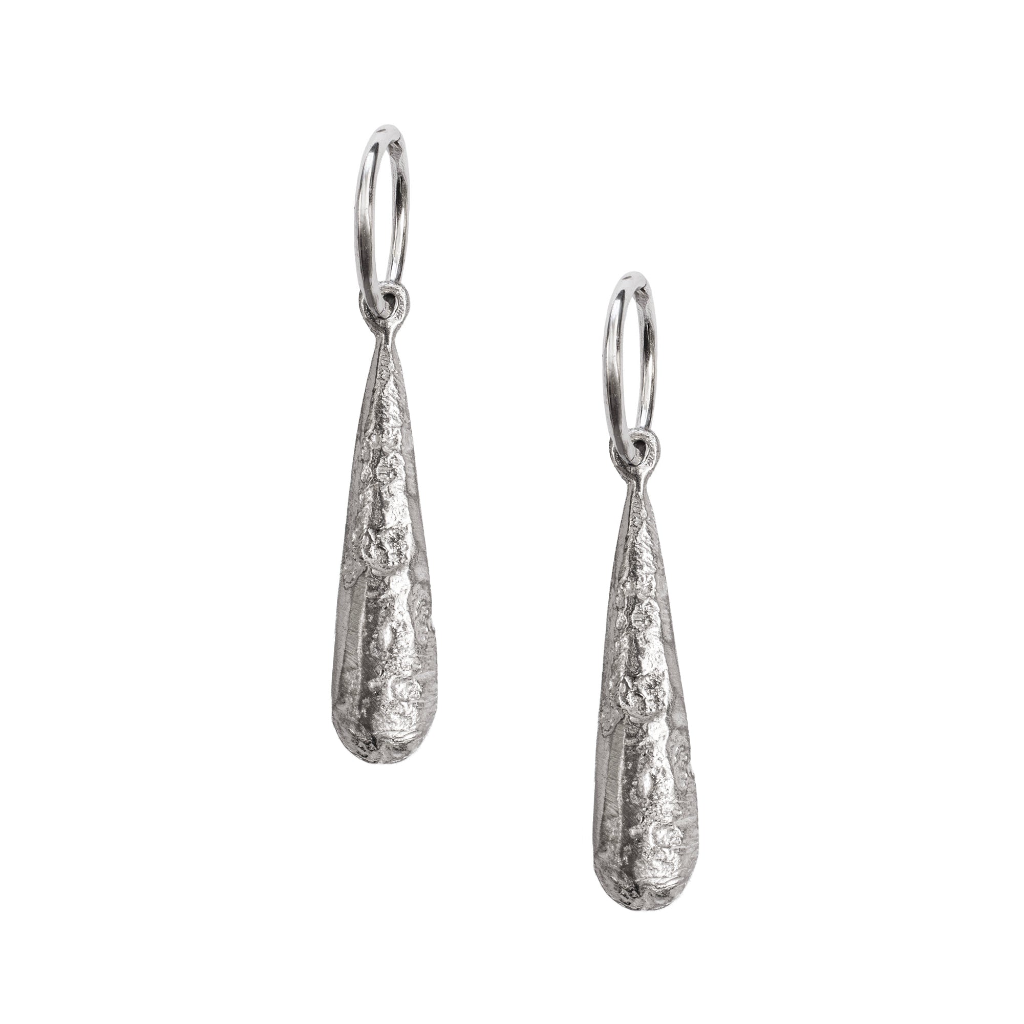 Hand-carved in solid silver, these elongated teardrop charms hang from seamless mini-hoop earrings. Their eroded surface texture gives them a raw, elemental feel—like relics shaped by time and memory. Pictured in Blackened Silver finish.