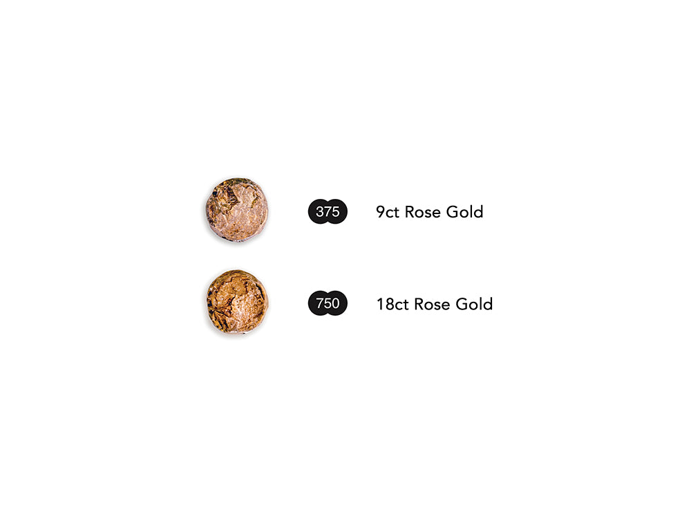 9ct Rose Gold is paler and pinker in tone; 18ct Rose Gold is a deeper redder shade.