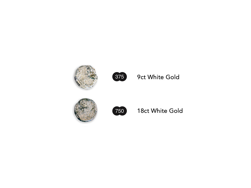 9ct White Gold is a paler shade of grey, closer in appearance to unoxidised Sterling Silver. 18ct White Gold is a deeper shade of grey, closer in appearance to oxidised Sterling Silver.