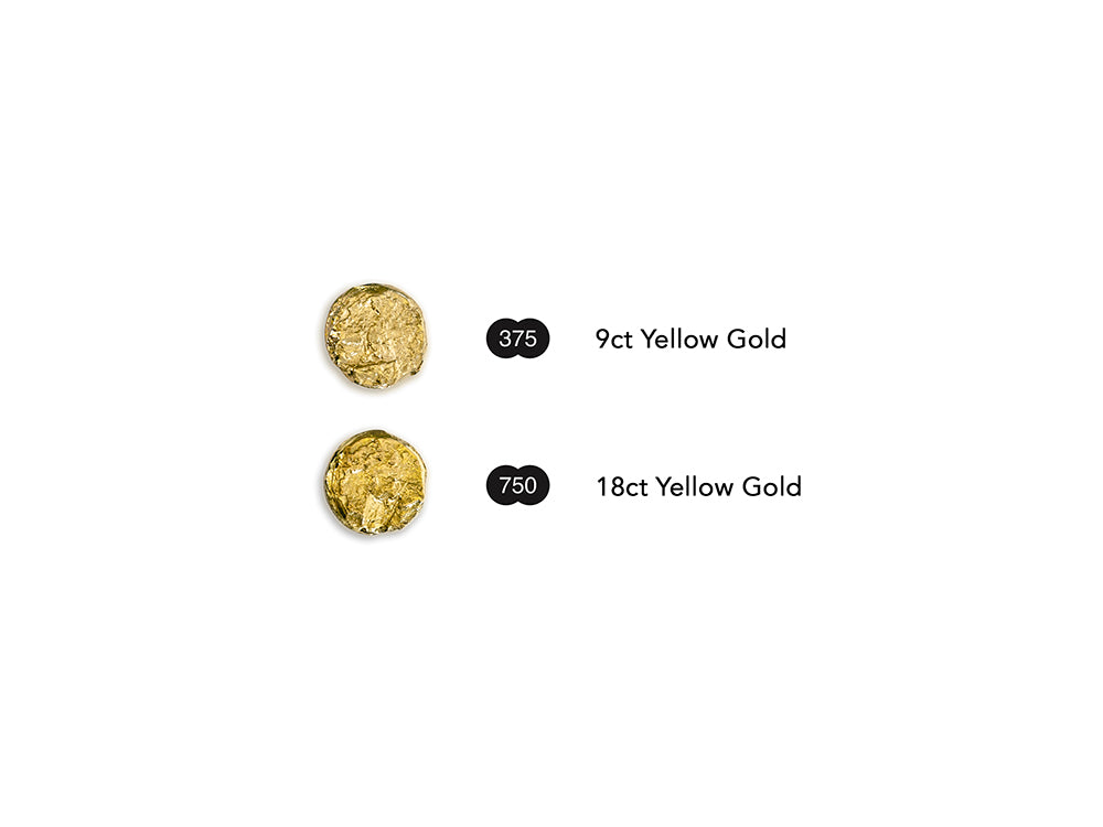 9ct Yellow Gold is more subtle and light-toned yellow than 18ct Yellow Gold, which is deeper and richer in tone.