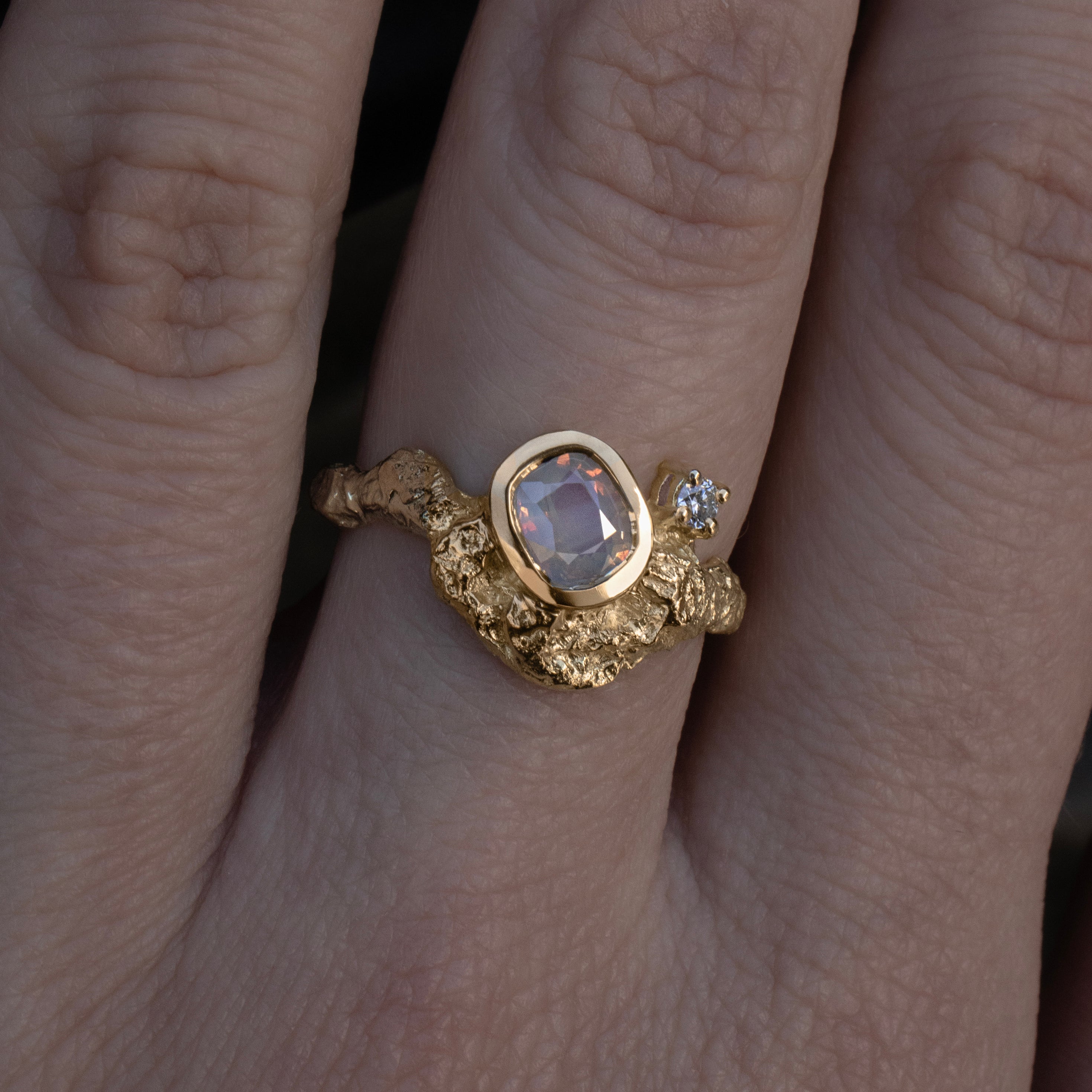 Crafted in 18ct Yellow Gold, this sculptural ring features a 0.72ct naturally opalescent grey sapphire that shifts in tone with the light—soft grey to pale blue to peach, with vivid flashes of orange that blaze like a sunset through stormclouds. A single natural white diamond offers contrast and clarity; a composition that carries both radiance and mood in equal measure.